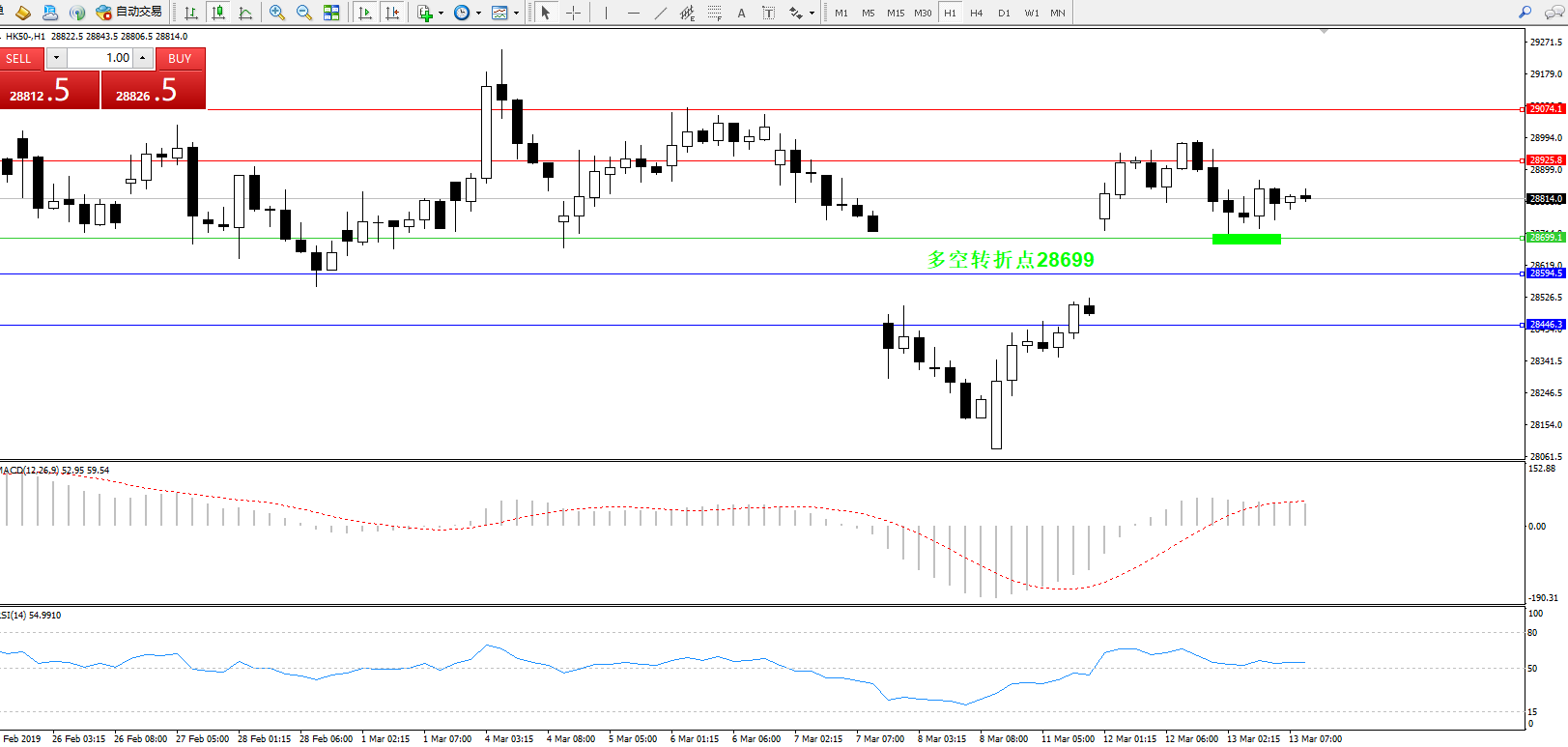香港恒生指数收盘跌0.4%至28807.45点。美国劳工部周三公布的数据显示,2月美国生产者物价指数(PPI)几乎没有上涨,并创下一年半多来的最小同比涨幅。这是通胀温和的最新迹象,支持美联储今年对进一步加息的观望态度。目前港股不跟随外围股市走动的机会非常大,不排除内地有利好政策消息发放,加上近日A股表现强势,故港股现阶段趋向大幅回调言之尚早。不过港股只要失守28860点,回调机会较大;相反,如果能回升触及29300点,有力再行向上。