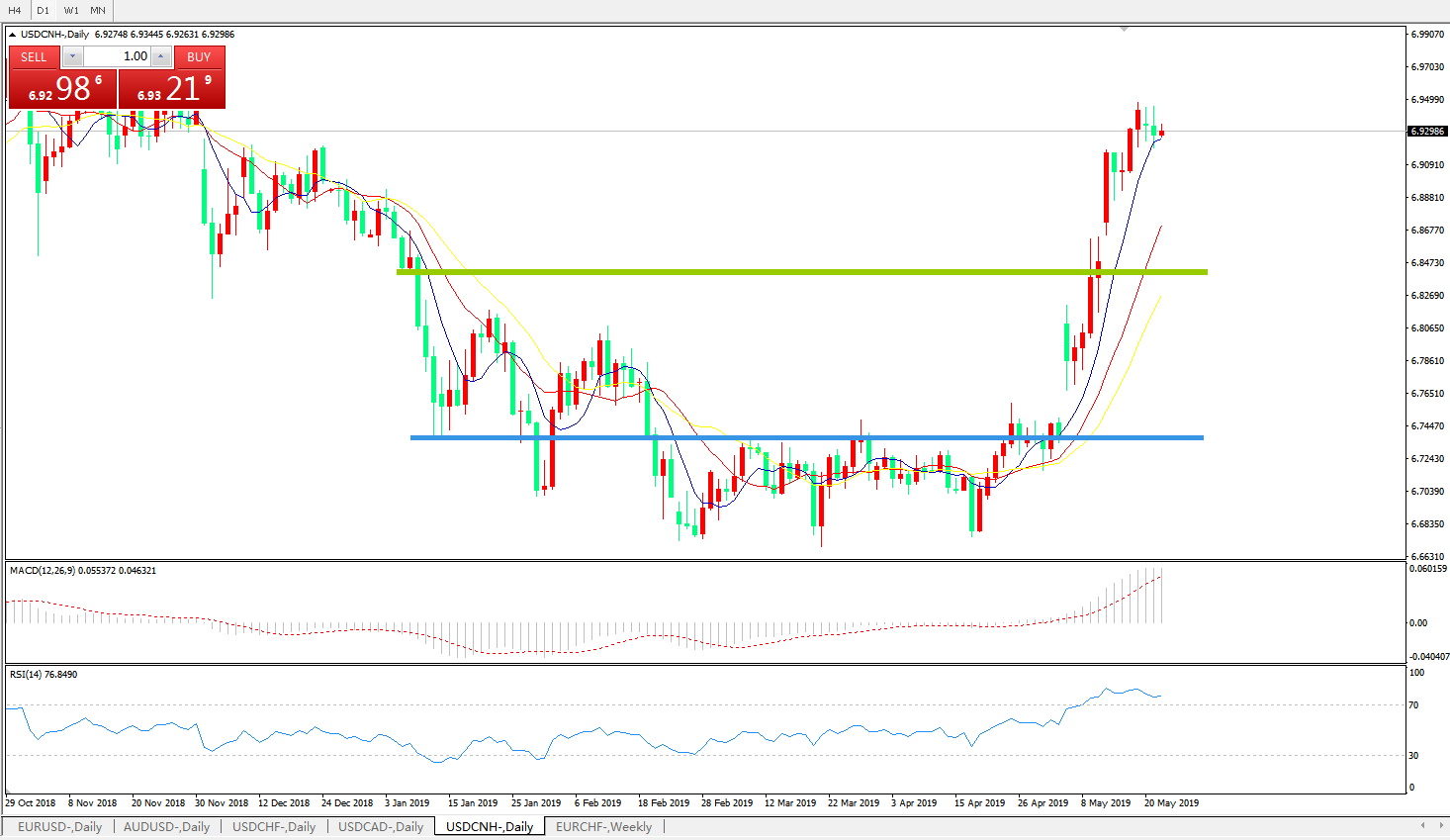 技术面简析:日线图均线呈有序多头排列看多,短期均线有回归修正需求,MACD在0轴上方运行且动能柱0轴上方持续放量,RSI超买区域有下行迹象,汇价强力上攻后维持整理态势,预计短期汇价有进一步上行空间,中期重点关注中美贸易争端后续进展。