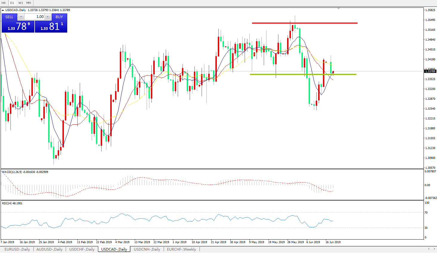 美元兑加元未能利用日内创出的两周高点1.3432,目前有所回落, 因欧洲央行行长德拉基释放鸽派言论,美元买需短时间温和回升,这使得美元兑加元有所走高; 但是由于市场预期美联储将会发表鸽派言论,且将会为降息提供明确的线索,因此美元多头未能进一步发力; 此前由于原油盘中大幅走高也对加元提供了部分支撑; 数据方面,周二令人失望的4月加拿大制造业订单数据很大程度上被美国走坏的5月新屋开工年化月率所抵消; 考虑到在过去两个交易日美元兑加元维持在一个震荡区间,因此在汇价选择方向前料市场持有谨慎立场;