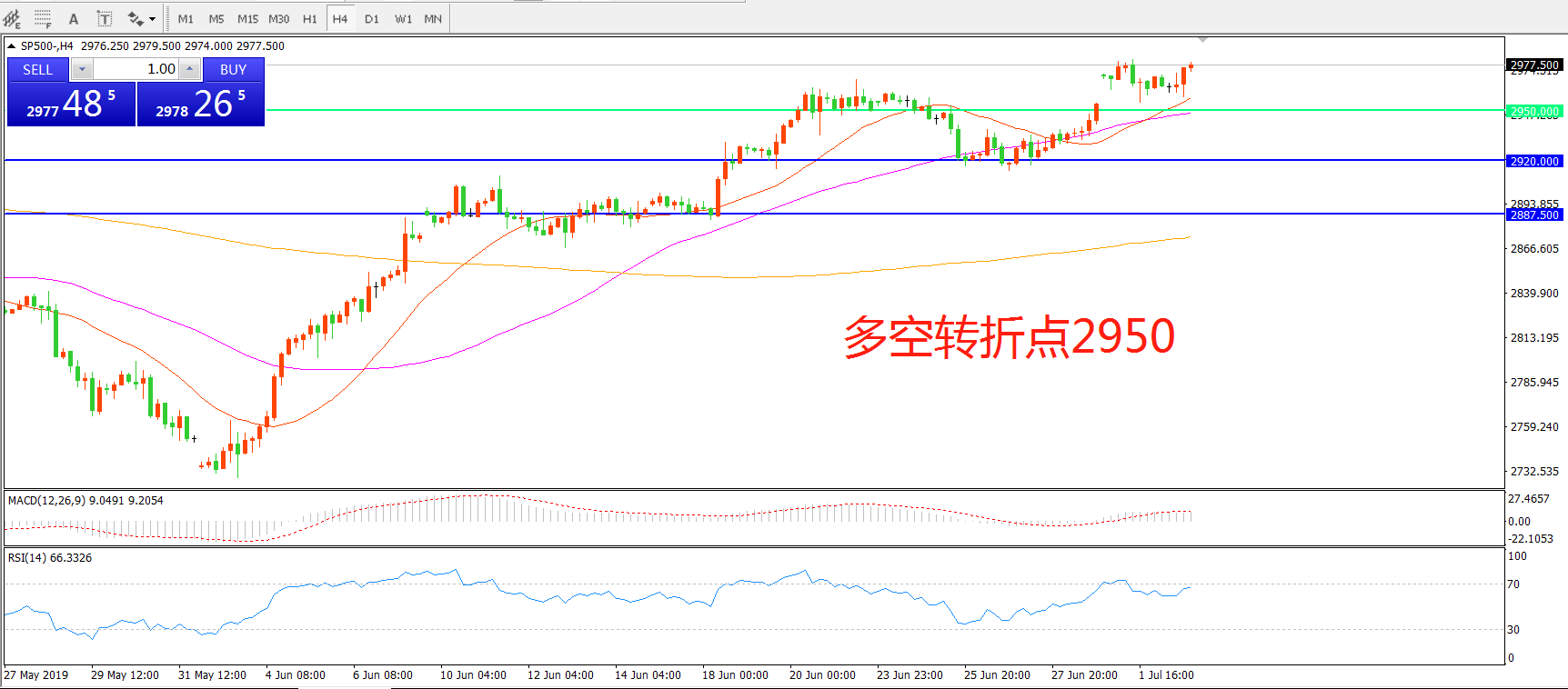 4小时图看,标普站稳2950后震荡上行,反弹动能较强,均线系统粘合成为下方支撑,MACD红柱增加,RSI指标拐头向上,日内延续上行概率较大。