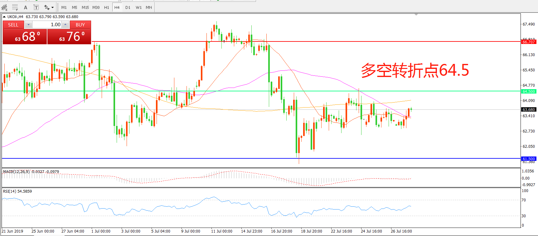 随着消费支出的增加,美国经济增长在第二季度放缓低于预期,但全球贸易的担忧情绪依然还在延续,中美代表团准备进行新一轮谈判令原油多头信心受到鼓舞,原油价格小幅攀升, 布伦特原油周一收涨0.2%,报63.68美元/桶。美联储议息会议前,市场观望氛围较浓。