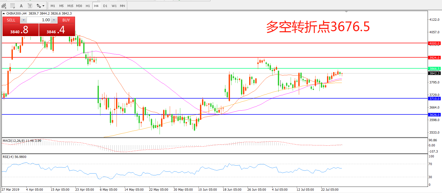 4小时图看,沪深300指数延续窄幅震荡,均线系统粘合形成支撑,RSI指标走平,日内若能突破3866.5一线阻力,整体将进一步上行。