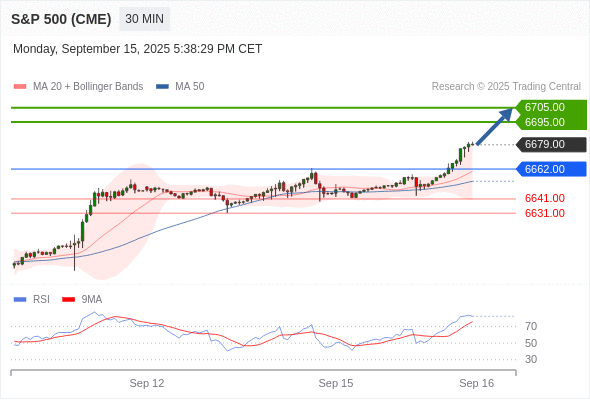 美国标普500指数期货 (Z5) 当日内: 在6662.00之上,看涨。