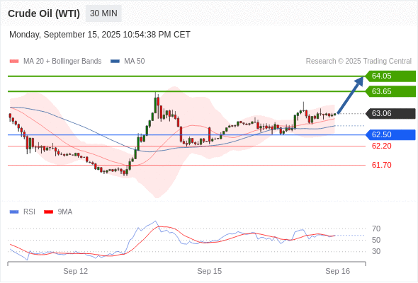 在 62.50 之上,看涨,目标价位为 63.65 ,然后为 64.05 。