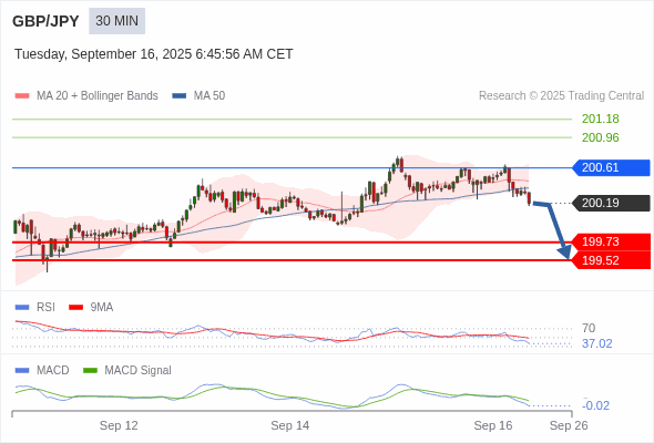 英镑/日元 当日内 : 看跌,在 200.61 之下。
