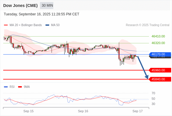 美国道琼斯指数期货 (Z5) 当日内: 短期关键阻力位在46170.00。