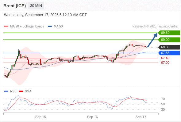 交易策略: 在 67.85 之上,看涨,目标价位为 69.00 ,然后为 69.60 。