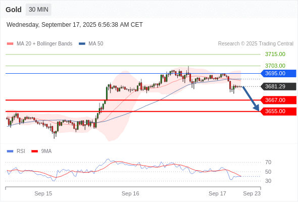 在 3695.00 之下,看跌,目标价位为 3667.00 ,然后为 3655.00 。