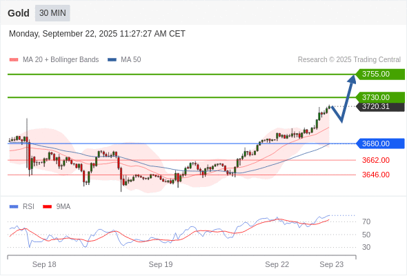 在 3680.00 之上,看涨,目标价位为 3730.00 ,然后为 3755.00 。