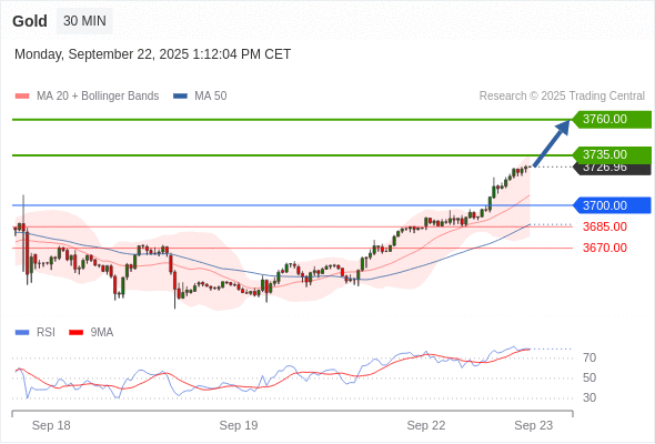在 3700.00 之上,看涨,目标价位为 3735.00 ,然后为 3760.00 。