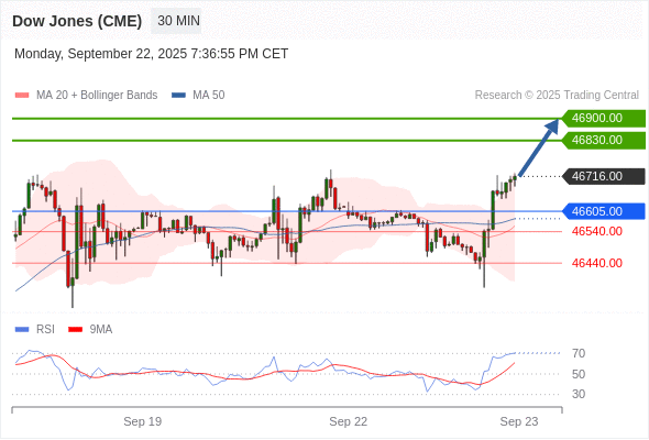 在 46605.00 之上,看涨,目标价位为 46830.00 ,然后为 46900.00 。