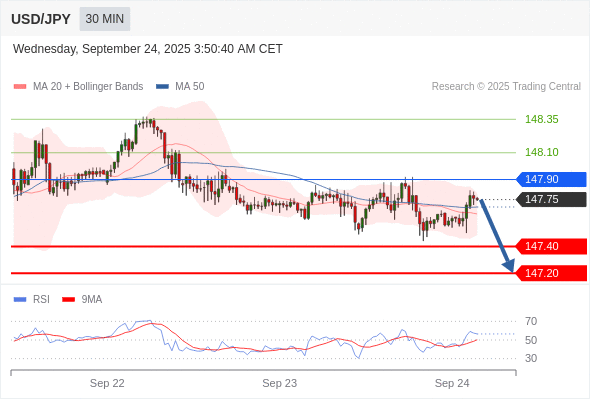 在 147.90 之下,看跌,目标价位为 147.40 ,然后为 147.20 。