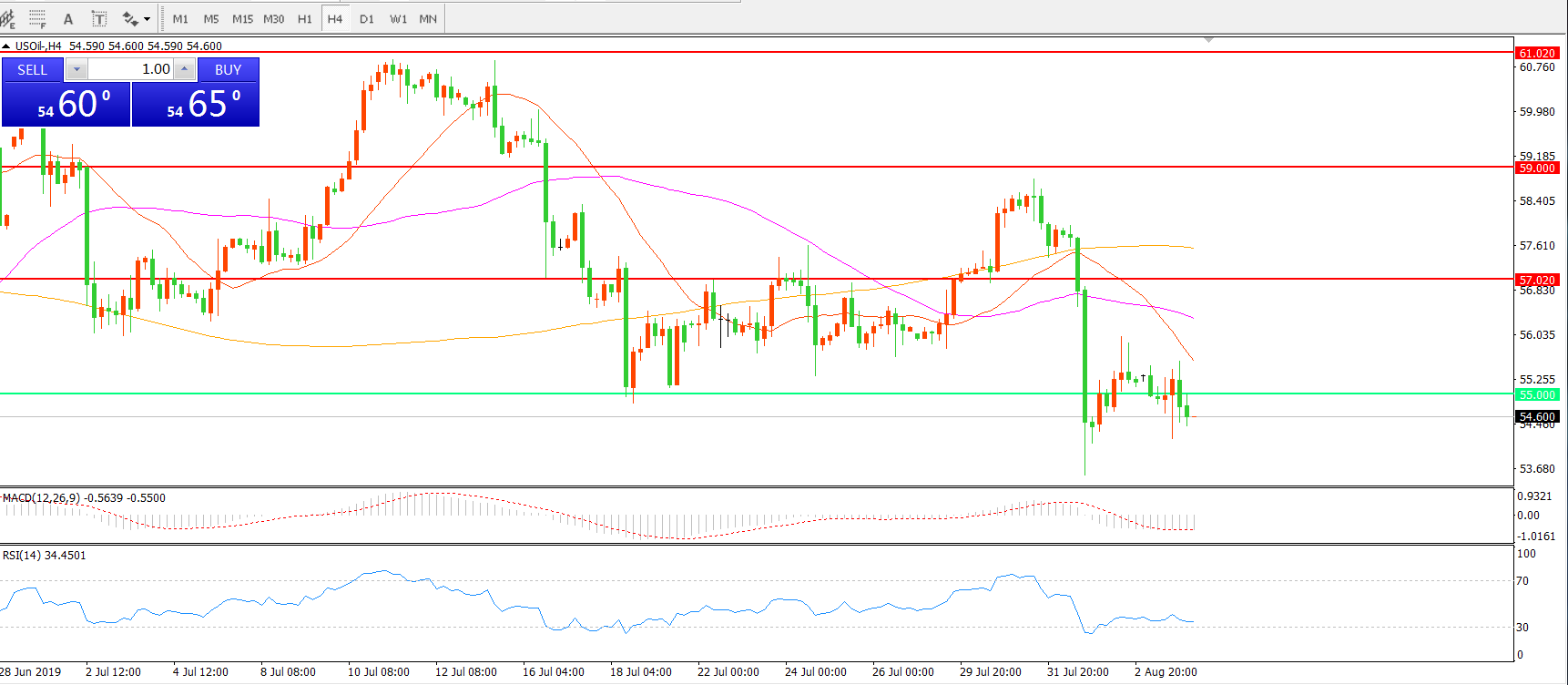 4小时图看,油价跌破55一线支撑后小幅反弹,但冲高力度低于前期高点,整体走势偏弱,MACD绿柱增加, RSI指标向下,日内延续下行概率较大。