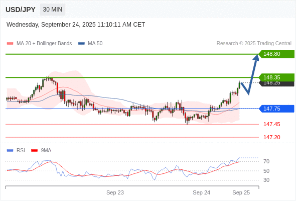 在 147.75 之上,看涨,目标价位为 148.35 ,然后为 148.80 。