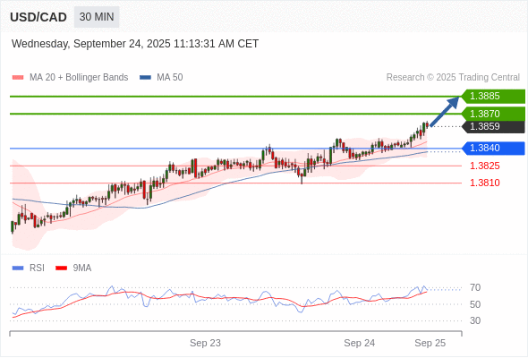 在 1.3840 之上,看涨,目标价位为 1.3870 ,然后为 1.3885 。