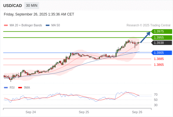 在 1.3905 之上,看涨,目标价位为 1.3955 ,然后为 1.3975 。