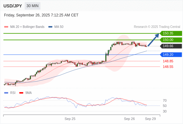 在 149.20 之上,看涨,目标价位为 150.00 ,然后为 150.35 。