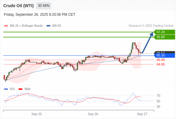 在 65.35 之上,看涨,目标价位为 66.80 ,然后为 67.20 。