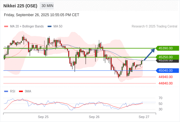 在 45040.00 之上,看涨,目标价位为 45250.00 ,然后为 45390.00 。