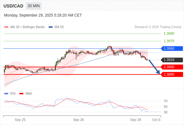 在 1.3950 之下,看跌,目标价位为 1.3900 ,然后为 1.3880 。