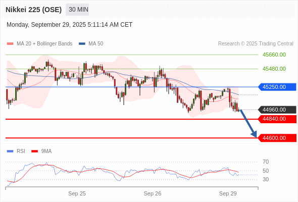 交易策略: 在 45250.00 之下,看跌,目标价位为 44840.00 ,然后为 44600.00 。