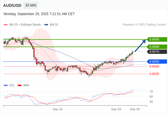 在 0.6550 之上,看涨,目标价位为 0.6580 ,然后为 0.6595 。