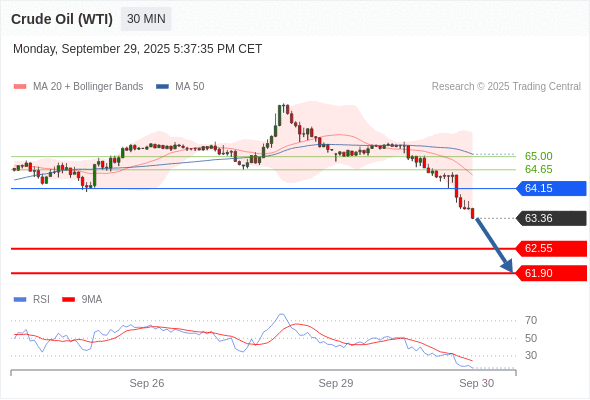 在 64.15 之下,看跌,目标价位为 62.55 ,然后为 61.90 。
