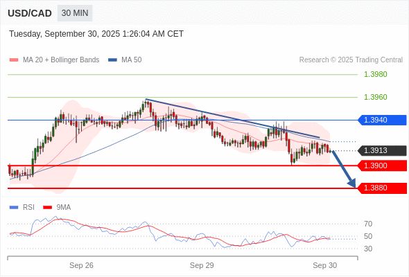 在 1.3940 之下,看跌,目标价位为 1.3900 ,然后为 1.3880 。