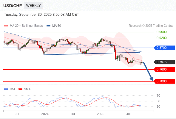 交易策略: 在 0.8700 之下,看跌,目标价位为 0.7600 ,然后为 0.7000 。