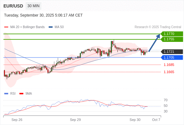在 1.1705 之上,看涨,目标价位为 1.1755 ,然后为 1.1770 。