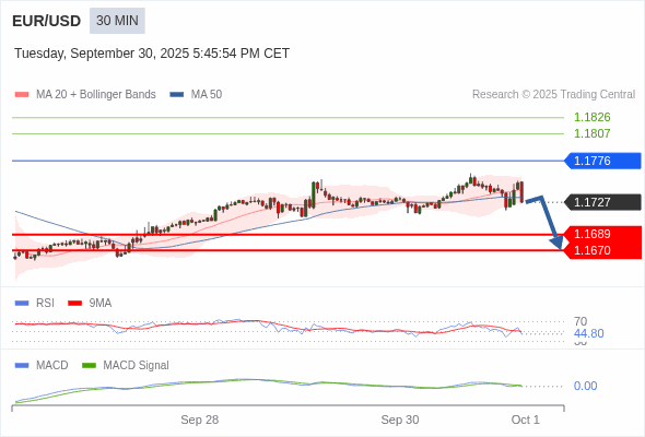 欧元/美元 当日内 : 看跌,当 1.1776 为阻力位。