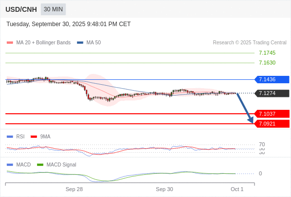 备选策略: 向上突破 7.1436 ,将带来继续上行的趋势,目标位定在 7.1630 和 7.1745 。