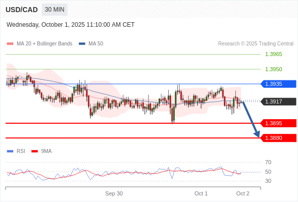 在 1.3935 之下,看跌,目标价位为 1.3895 ,然后为 1.3880 。