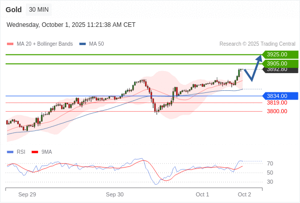 在 3834.00 之上,看涨,目标价位为 3905.00 ,然后为 3925.00 。