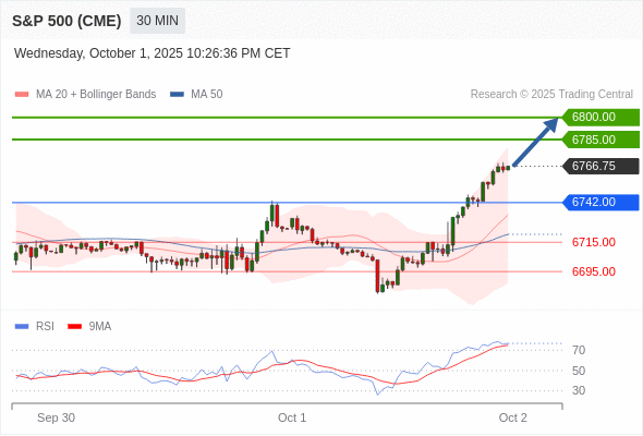 在 6742.00 之上,看涨,目标价位为 6785.00 ,然后为 6800.00 。