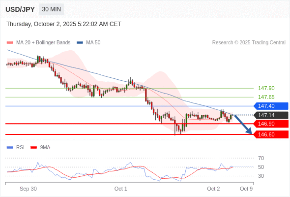 在 147.40 之下,看跌,目标价位为 146.90 ,然后为 146.60 。