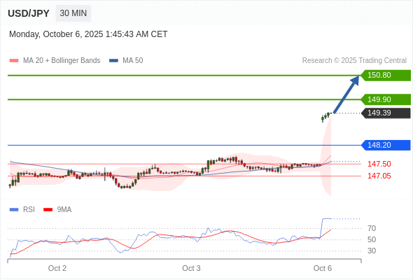 在 148.20 之上,看涨,目标价位为 149.90 ,然后为 150.80 。