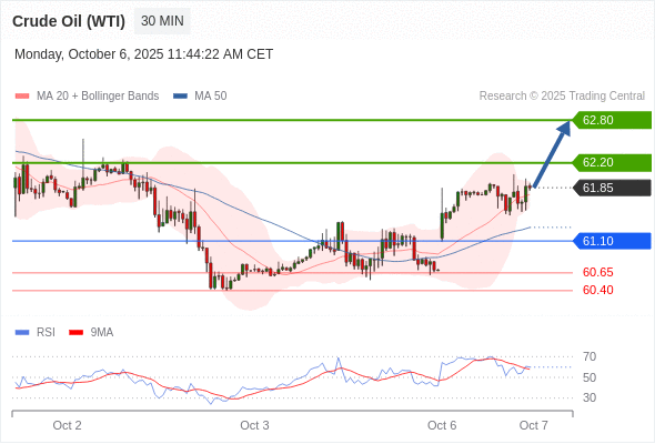 在 61.10 之上,看涨,目标价位为 62.20 ,然后为 62.80 。