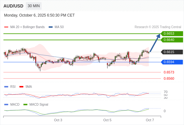 澳元/美元 当日内: 看涨,当 0.6594 为支撑位。