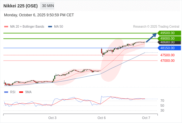 日经225股指期货 (OSE) 当日内: 在48150.00之上,看涨。