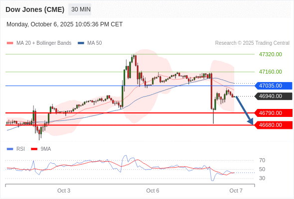 在 47035.00 之下,看跌,目标价位为 46790.00 ,然后为 46680.00 。