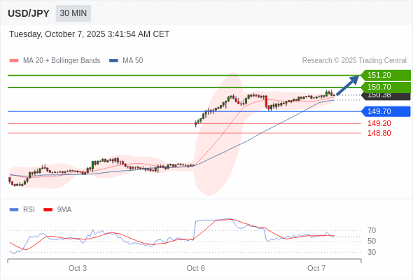 在 149.70 之上,看涨,目标价位为 150.70 ,然后为 151.20 。