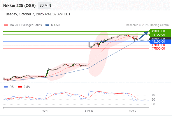 日经225股指期货 (OSE) 当日内: 在48100.00之上,看涨。