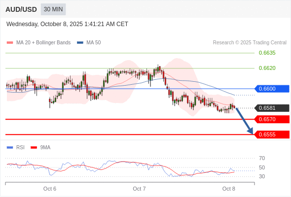 在 0.6600 之下,看跌,目标价位为 0.6570 ,然后为 0.6555 。