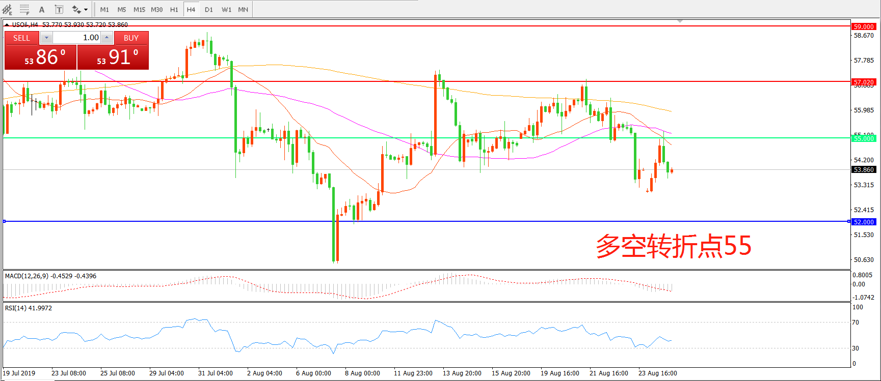 周一(8月26日),特朗普发推表示,中美双方周末通了两次电话,两国将开始认真谈判,一时间围绕中美达成贸易协议的乐观情绪提振了油价反弹,但随后中国外交部发言人耿爽在例行记者会上表示:“对于美方提到的周末通话,我没有听说过。”油价整体呈现冲高回落走势,最终收报53.9美元/桶。