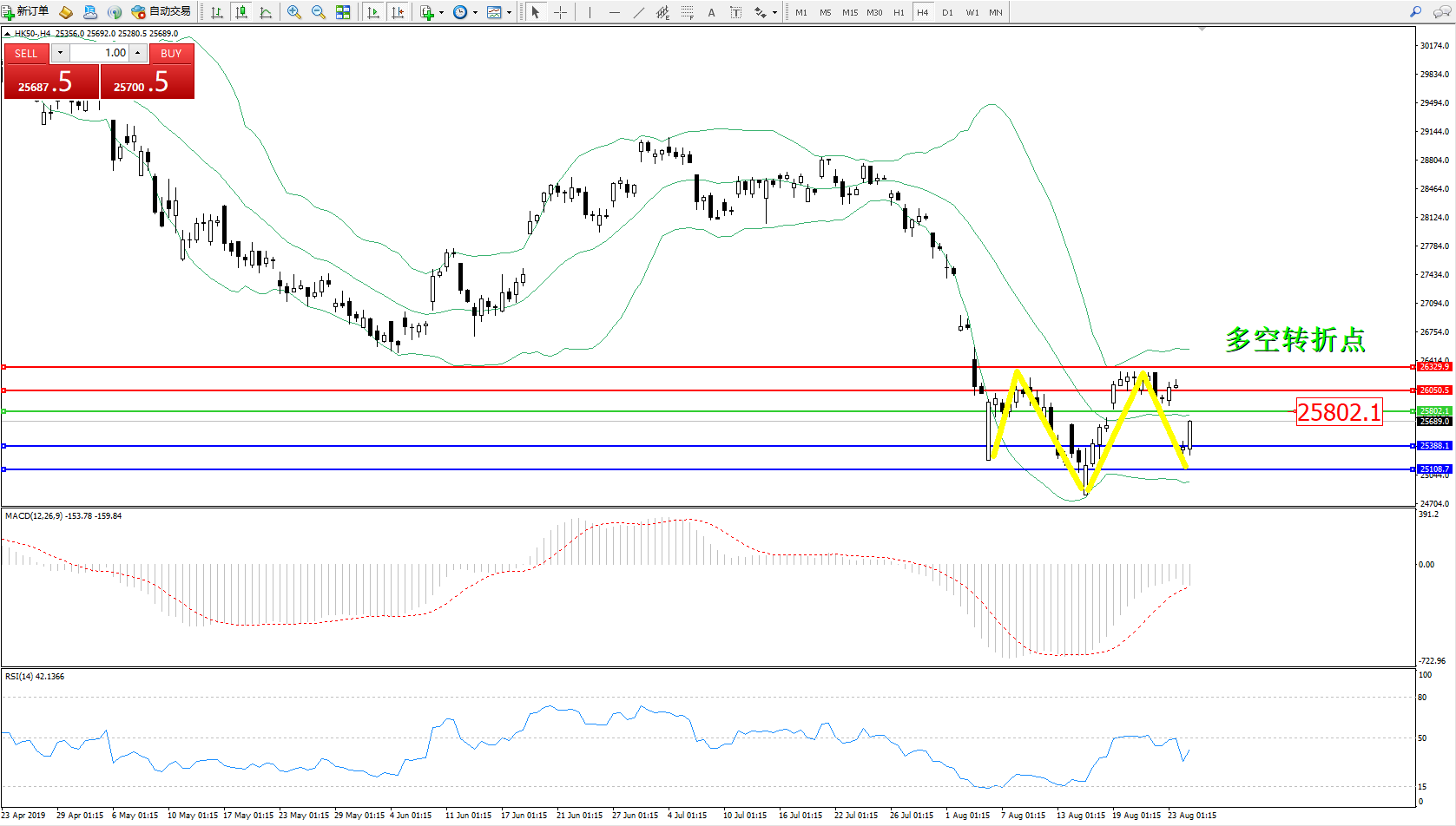 香港恒生指数826日(周一)收盘下跌499.00点,跌幅1.91%,报25680.33点;贸易紧张局势影响持续发酵,令市场对全球经济前景的担忧显著升温,本周一延续上周五欧美股市跌势,美联储将在9月货币政策例会上再次下调联邦基金利率。美联储731日宣布将联邦基金利率目标区间下调25个基点到2%2.25%的水平,是200812月以来首次降息;商务部新闻发言人就美方宣布进一步提高对中国输美商品加征关税税率发表谈话称,824日,美方宣布将提高对约5500亿美元中国输美商品加征关税的税率,中方对此坚决反对。