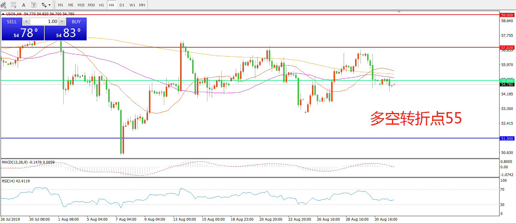 4小时图看,油价整体维持震荡态势,均线系统逐渐走平,55周期均线成为短期上方阻力,整体走势偏弱,均线系统走平,MACD红柱减少, RSI指标向下,日内延续震荡概率较大。