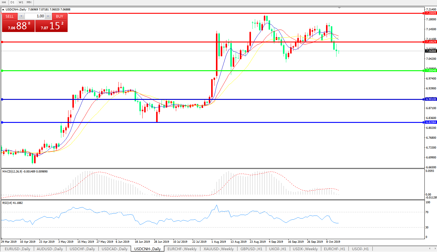 技术面简析:日图短期均线快速拐头下行,汇价昨日小幅下行后止跌回升,MACD运行于0轴上方但量能快速缩量,RSI快速走低,预计短期汇价将进一步下行,短期汇价运行于7.00-7.10区间的概率较大;中美贸易后续谈判进展将决定汇价最终趋势。