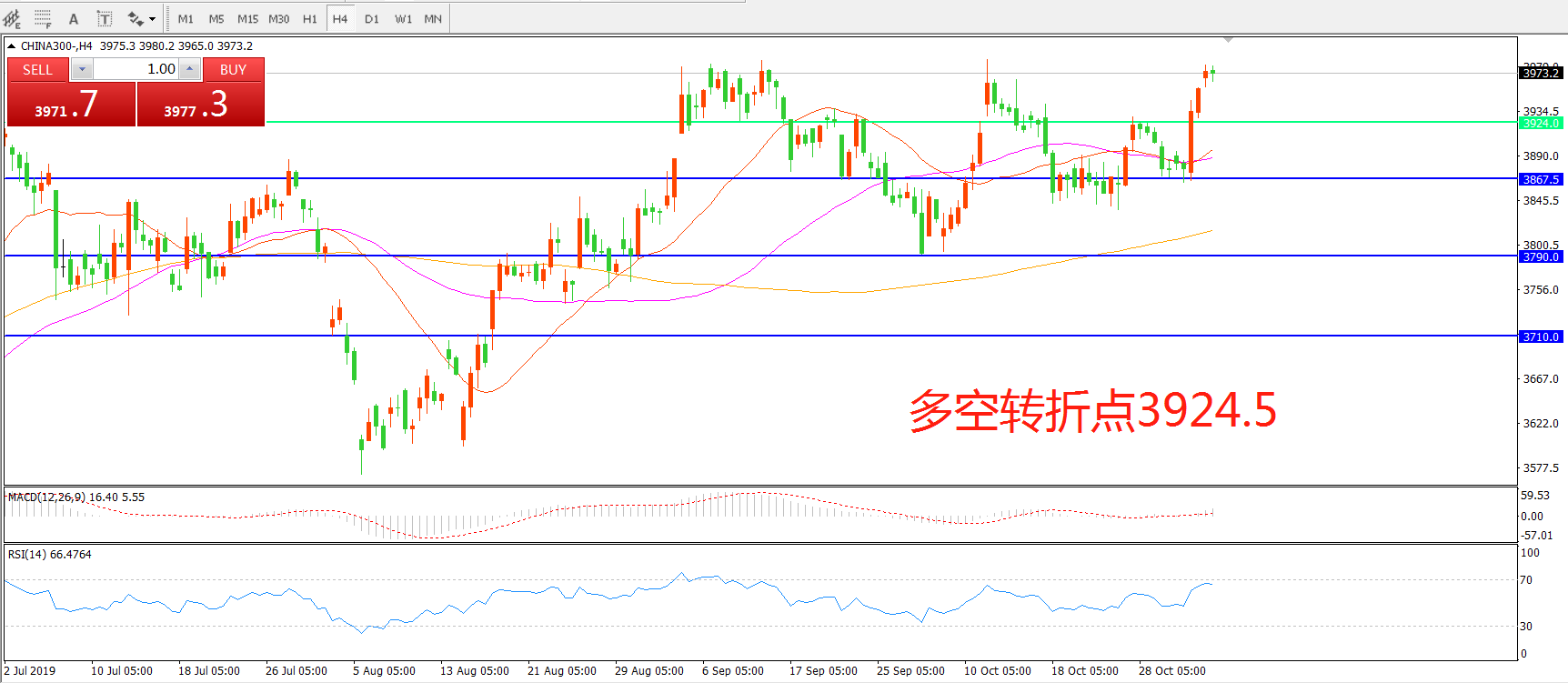 4小时图看,沪深300跳空高开后维持高位震荡,整体走势偏强,均线系统走平,MACD红柱增加,RSI指标向平,日内延续上行概率较大,如能突破3985,有望开启新一波上涨行情。