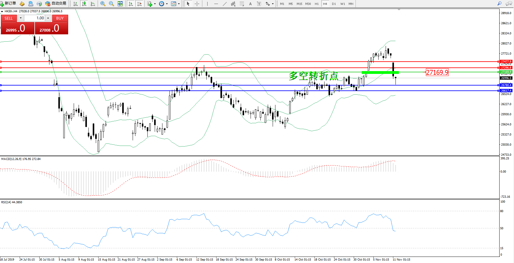 香港恒生指数11月11日(周一)收盘下跌724.59点,跌幅2.62%,报26926.55点;港股大幅低开289点,随后再逐步扩大跌幅,恒指低见27002,似在退回27000关口。恒指的走势似乎确认了目前处于震荡的格局。或许经济周期的短暂恢复可能会让恒指有继续走强的理由,投资者正在谨慎评估贸易协议进展方面相互矛盾的消息与经济数据。但通胀、货币政策,以及各种各样不确定性带来的压力,也会限制恒指的走势。